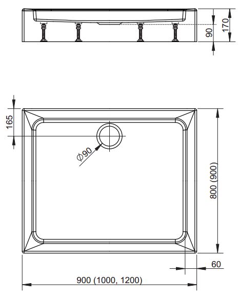 Prostokątny brodzik ze zintegrowaną obudową, nóżki w komplecie, otwór na syfon Ø90mm.