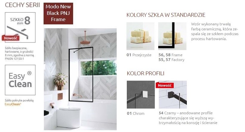 Parawany z serii Modo New Black zostały stworzone z myślą o najnowszych trendach w projektowaniu łazienek. Wszystkie modele wykonane są z dbałością o najdrobniejsze szczegóły, tak aby komfort z ich posiadania towarzyszył Państwu każdego dnia. Czarna ramka wykonana farbą ceramiczną podkreśli surowy, a zarazem elegancki charakter łazienki. Dzięki temu, że zdobienie zespalane jest ze szkłem w procesie hartowania, kabinę wyróżnia trwałość, ponadprzeciętna jakość oraz odporność na ścieranie i promieniowanie UV.