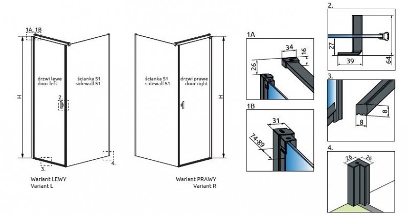 Proszę zwrócić uwagę na ilość szprosów na drzwiach i ściance bocznej kabiny patrz tabela, kolumna „Wariant”.