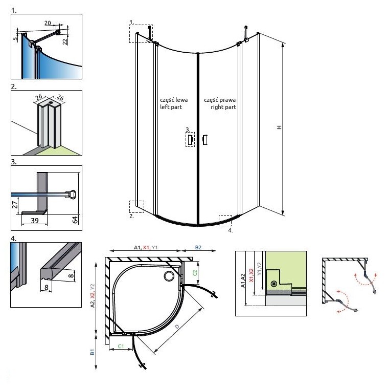 • Zawias rurowy - Umożliwia otwieranie drzwi do wewnątrz i na zewnątrz kabiny