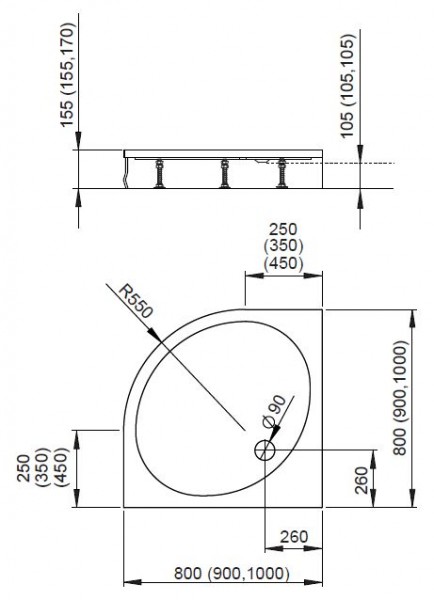 Półokrągły brodzik ze zdejmowaną obudową z otworem o średnicy 90 mm, zalecany syfon TB 90P.