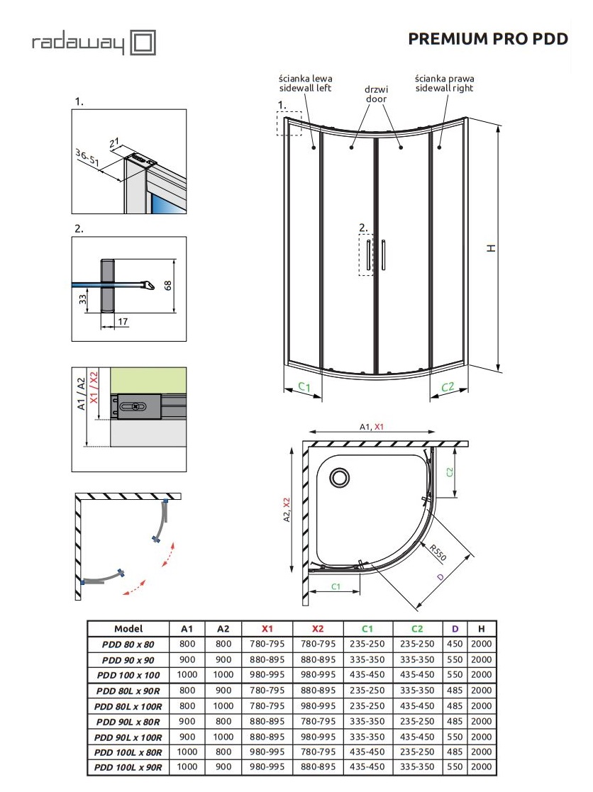 Uwaga! - Standardowo kabiny dopasowane są do montażu na brodziku o określonych wymiarach i właśnie te wymiary są podane w nazwie kabiny lub jej części. Rzeczywiste wymiary gabarytowe kabiny są nieco mniejsze od nominalnych podanych w nazwie artykułu. Jeśli planujesz montaż kabiny bezpośrednio na posadzce, zwróć uwagę na wymiary gabarytowe (X1, X2) oraz wymiary do osi szyby (Y1, Y2), które podane są na rysunku technicznym
