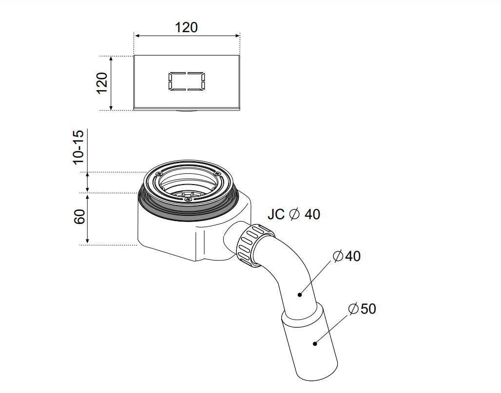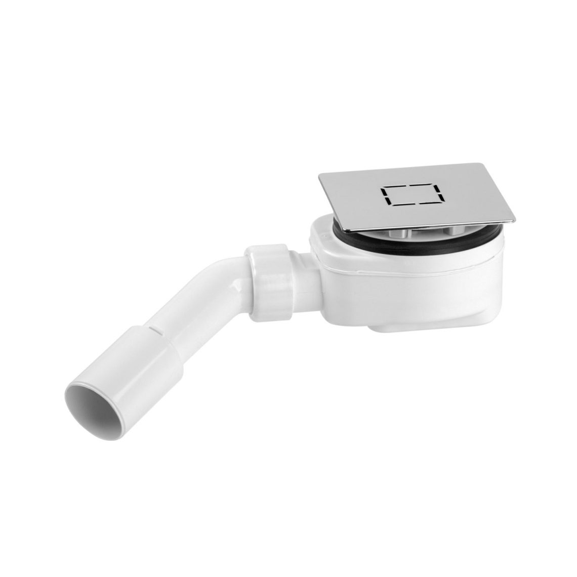 Syfon do brodzików z otworem odpływowym o średnicy 90 mm, samoczyszczący z podwyższoną prędkością spływu wody 38l/min, z chromowaną kwadratową pokrywą o długości boku 120 mm i łukiem odpływowym 135°; odpływ o średnicy 40/50 mm; wysokość 70mm.