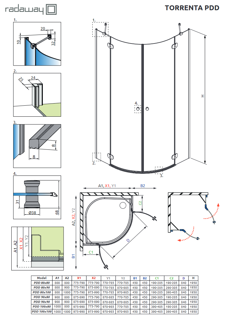 *Uwaga! Wymiar kabiny dopasowany jest do montażu na brodziku o standardowym rozmiarze. W rzeczywistości kabina jest mniejsza. Jeśli planujesz montaż kabiny bezpośrednio na posadzce, zwróć uwagę na wymiary do osi szyby (Y1, Y2), które podane są na rusynku technicznym.