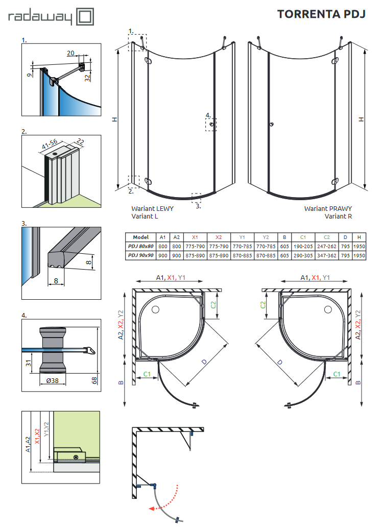 *Uwaga! Wymiar kabiny dopasowany jest do montażu na brodziku o standardowym rozmiarze. W rzeczywistości kabina jest mniejsza. Jeśli planujesz montaż kabiny bezpośrednio na posadzce, zwróć uwagę na wymiary do osi szyby (Y1, Y2), które podane są na rusynku technicznym.