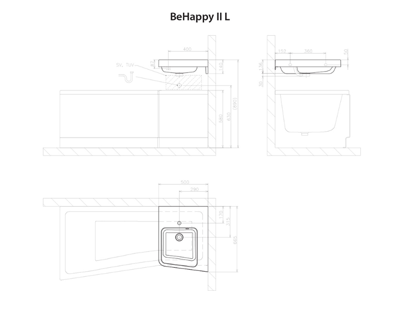 Narożna umywalka BeHappy II jest wykonana z przelewem. Instalacja na ścianie do rogu lub na wanną BeHappy II, gdzie tworzy unikalne rozwiązanie oszczędnie wykorzystujące przestrzeń przy zachowaniu wszelkich walorów użytkowych. Prawy lub lewy wariant umywalki określa dłuższa krawędź umieszczona do rogu łazienki. Baterię zainstaluj na krawędzi umywalki umieszczonej naprzeciwko siebie. Umywalka jest dostarczana z 35 mm otworem do baterii stojącej. Narożną umywalkę BeHappy II zalecamy uzupelnić niskim korkiem umywalkowym i syfonem rurowym. Dla uzyskania doskonale skomponowanej łazienki zalecamy łączenie umywalki z innymi produktami z konceptu BeHappy II (lustrem BeHappy II, wanną BeHappy II), bateriami RAVAK i innymi produktami. Zestaw montażowy (kołki, śruby, itd.), w tym system przelewowy jest w komplecie.