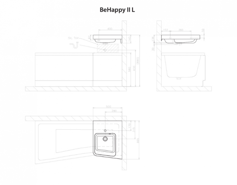 Narożna umywalka BeHappy II jest wykonana z przelewem. Instalacja na ścianie do rogu lub na wanną BeHappy II, gdzie tworzy unikalne rozwiązanie oszczędnie wykorzystujące przestrzeń przy zachowaniu wszelkich walorów użytkowych. Prawy lub lewy wariant umywalki określa dłuższa krawędź umieszczona do rogu łazienki. Baterię zainstaluj na krawędzi umywalki umieszczonej naprzeciwko siebie. Umywalka jest dostarczana z 35 mm otworem do baterii stojącej. Narożną umywalkę BeHappy II zalecamy uzupelnić niskim korkiem umywalkowym i syfonem rurowym. Dla uzyskania doskonale skomponowanej łazienki zalecamy łączenie umywalki z innymi produktami z konceptu BeHappy II (lustrem BeHappy II, wanną BeHappy II), bateriami RAVAK i innymi produktami. Zestaw montażowy (kołki, śruby, itd.), w tym system przelewowy jest w komplecie.