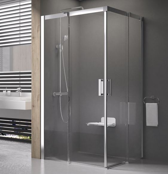 Produkt składa się z dwóch równych części i dwóch ruchomych, które tworzą przesuwne drzwi. Montaż w obłożonym płytką rogu łazienki na brodzikach RAVAK Perseus Pro Chrome, Perseus, Perseus Pro Flat lub bezpośrednio na podłodze z wbudowanym odpływem liniowym.
