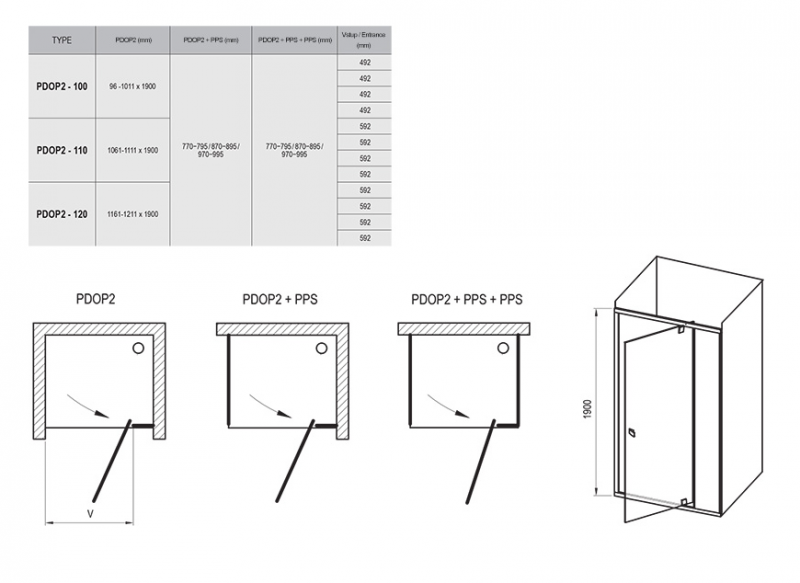 Produkt składa się z dwóch elementów prostych, w tym jednego ruchomego tworzącego obrotowe drzwi. Obracając produkt w trakcie montażu o 180° uzyskasz prawy lub lewy wariant otwierania drzwi. Montaż w obłożoną płytką wnęce lub rogu łazienki (po połączeniu ze ścianką stałą PPS) na brodzikach RAVAK PERSEUS, PERSEUS PRO, PERSEUS PRO FLAT, PERSEUS PRO CHROME, GIGANT PRO, GIGANT PRO FLAT, GIGANT PRO CHROME lub bezpośrednio na podłodze z wbudowanym odpływem liniowym czy kratką odpływową. Łącząc z dwiema ściankami stałymi utworzysz kabinę w kształcie „U“. Zastosowanie profilu poszerzającego PNPS pozwala poszerzyć produkt o 20 mm, dając doskonale dopasowanie do nierówności budowlanych, maksymalne poszerzenie nawet do 4 cm po każdej stronie.