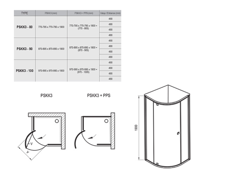 Produkt składa się z dwóch części stałych i jednej z giętego szkła tworzącej drzwi obrotowe. Obracając produkt w trakcie montażu o 180°, uzyskasz lewy lub prawy wariant otwierania drzwi. Montaż w obłożonym płytką rogu łazienki na brodzikach RAVAK RONDA, RONDA BASIC, ELIPSO, ELIPSO PRO, ELIPSO PRO FLAT, ELIPSO PRO CHROME lub bezpośrednio na podłodze z wbudowanym odpływem liniowym czy kratką odpływową.Jeśli nie dysponujesz wolnym narożnikiem łazienki, kabinę możesz uzupełnić ścianką stałą PPS i zaistalować przy ścianie. Dzięki zastosowaniu profilu poszerzającego produkt dopasujesz do nierówności budowlanych, aż o 4 cm po każdej stronie. Promień 500 mm.
