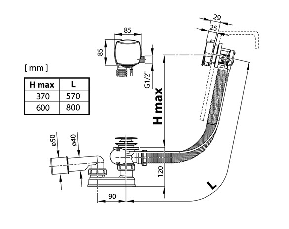 Syfon wannowy z napełnianiem przelewem II 570 mm - chrom
