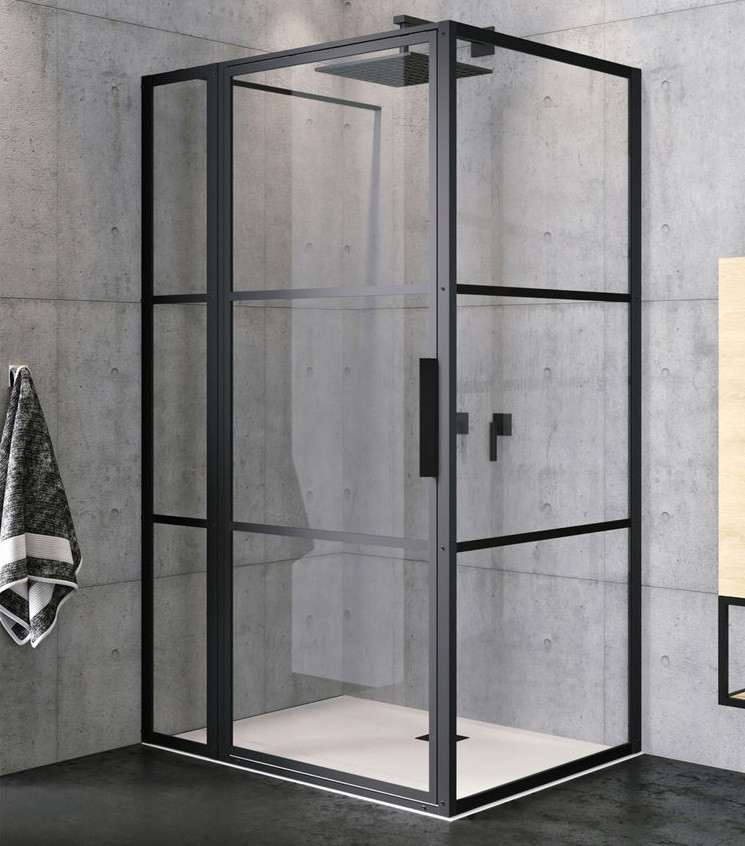 Seria kabin GRID to przede wszystkim czarne, matowe profile wykonane z malowanego proszkowo aluminium, które przymocowano po zewnętrznej stronie szkła. Takie rozwiązanie, wraz ze starannie dopracowanymi detalami: masywnymi uchwytami, widocznymi śrubami czy solidnymi wspornikami, zapewnia kabinom GRID 100% loftowego charakteru.