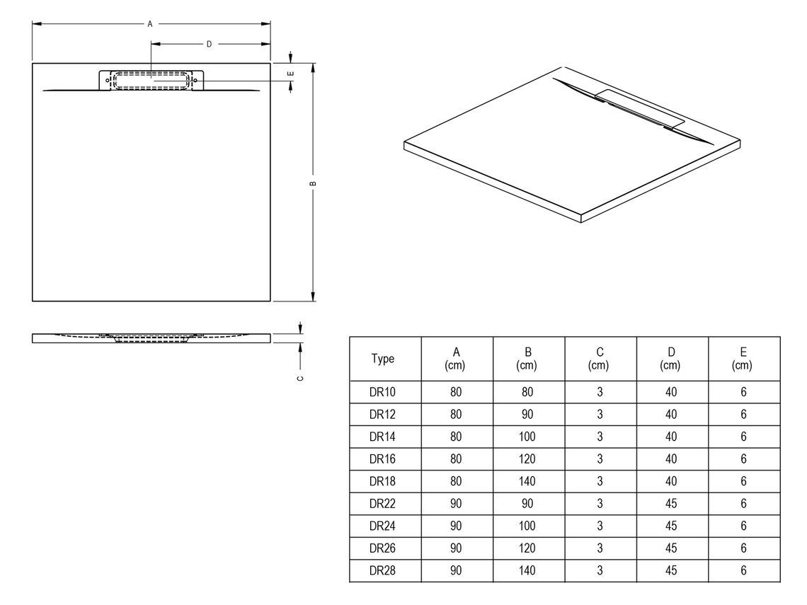 Brodzik należy zamontować bezpośrednio na podłodze lub w podłodze. Istnieje możliwość wyboru spośród 9 rozmiarów: od 80 x 80 cm do 140 x 90 cm.