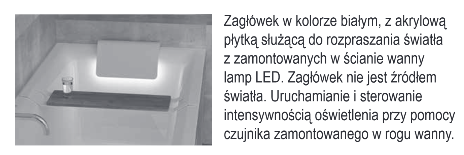 Wanna w wersji LED z podświetlanym zagłówkiem - oświetlenie LED zamontowane w ścianie wanny i sterowane za pomocą czujnika sensorowego zainstalowanego pod krawędzią wanny,