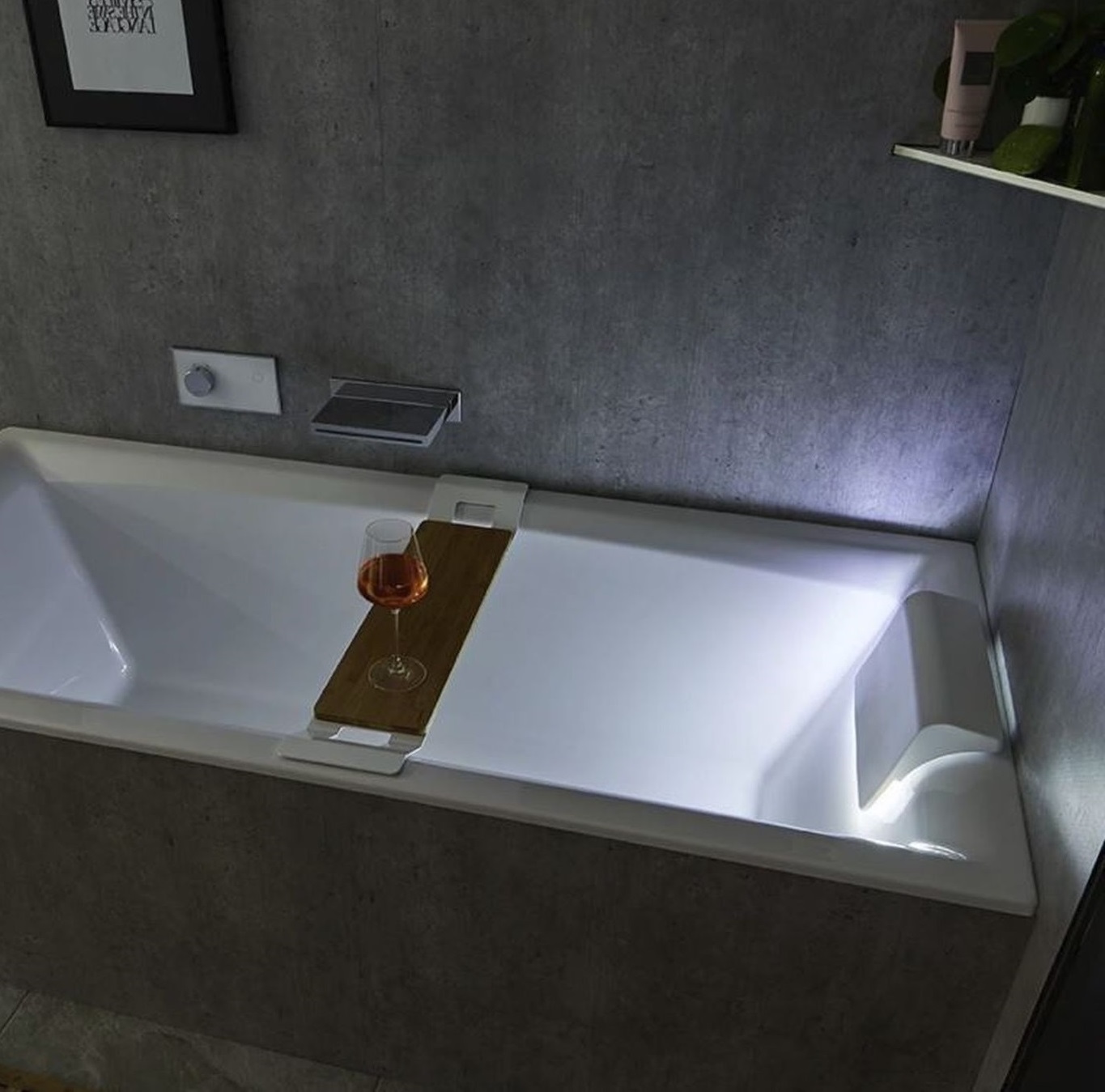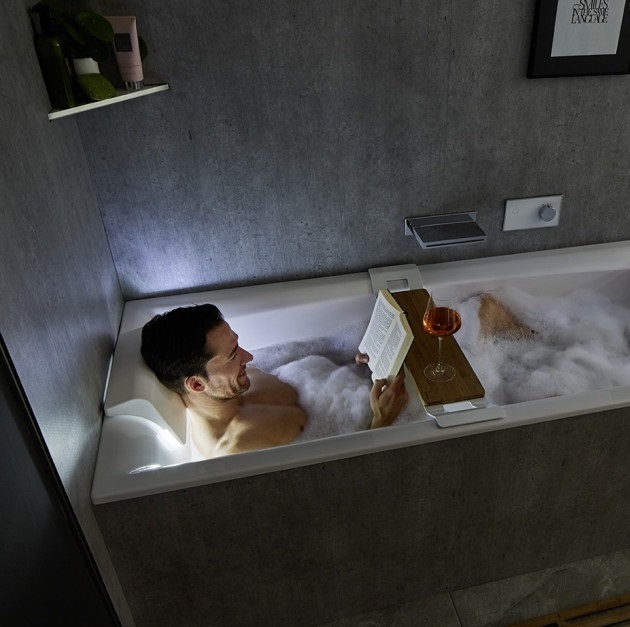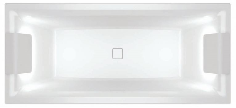 Zagłówek w kolorze białym, z akrylową płytką służącą do rozpraszania światła z zamontowanych w ścianie wanny lamp LED. Zagłówek nie jest źródłem światła. Światło regulowane jest za pomocą czujnika sensorowego zainstalowanego pod krawędzią wanny. Można je włączyć jednym ruchem ręki, a także ustawić jego intensywność.