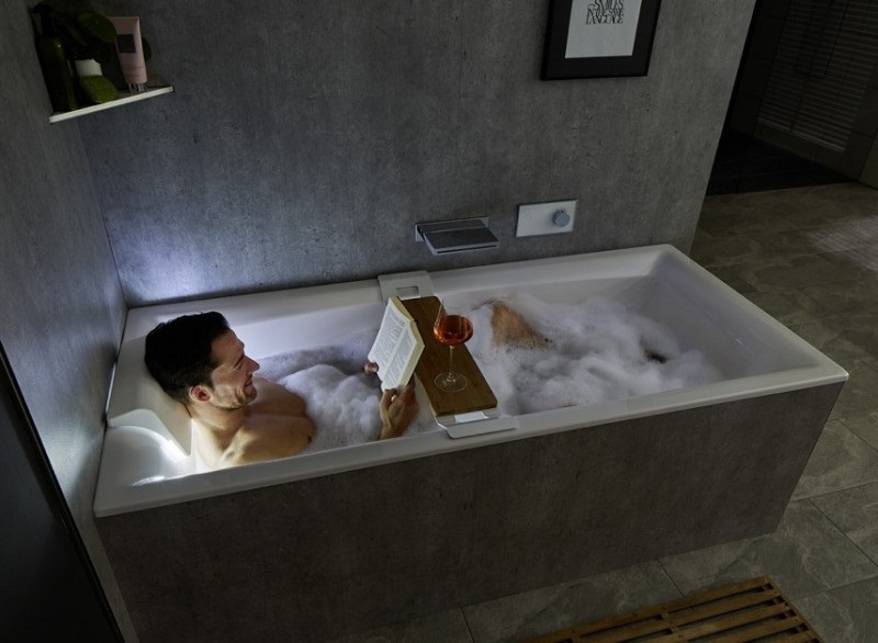 Zagłówek w kolorze białym, z akrylową płytką służącą do rozpraszania światła z zamontowanych w ścianie wanny lamp LED. Zagłówek nie jest źródłem światła. Światło regulowane jest za pomocą czujnika sensorowego zainstalowanego pod krawędzią wanny. Można je włączyć jednym ruchem ręki, a także ustawić jego intensywność.