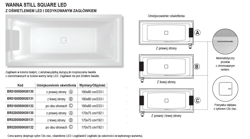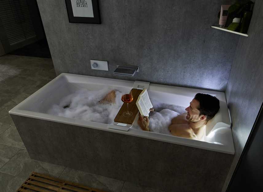 Zagłówek w kolorze białym, z akrylową płytką służącą do rozpraszania światła z zamontowanych w ścianie wanny lamp LED. Zagłówek nie jest źródłem światła. Światło regulowane jest za pomocą czujnika sensorowego zainstalowanego pod krawędzią wanny. Można je włączyć jednym ruchem ręki, a także ustawić jego intensywność.