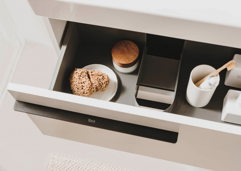 Wyjątkowe uchwyty szuflad chromowane lub w czarnym macie można dopasować do wybranego odcienia mebla.