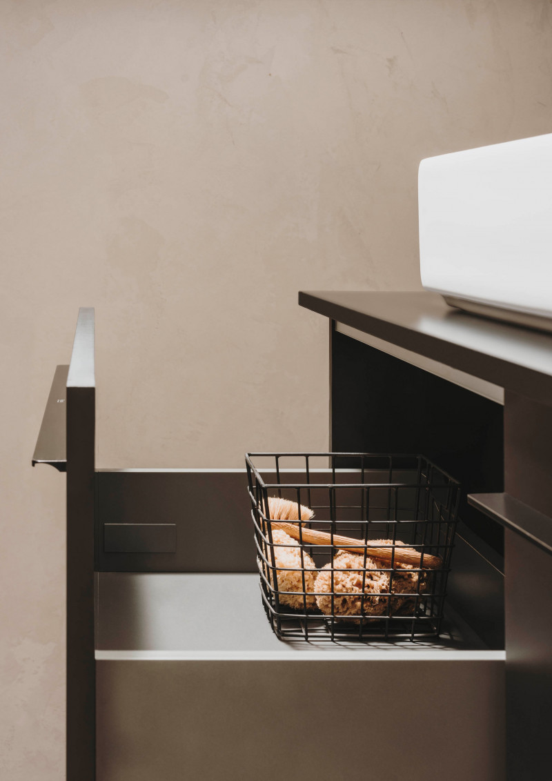 Wyjątkowe uchwyty szuflad chromowane lub w czarnym macie można dopasować do wybranego odcienia mebla.