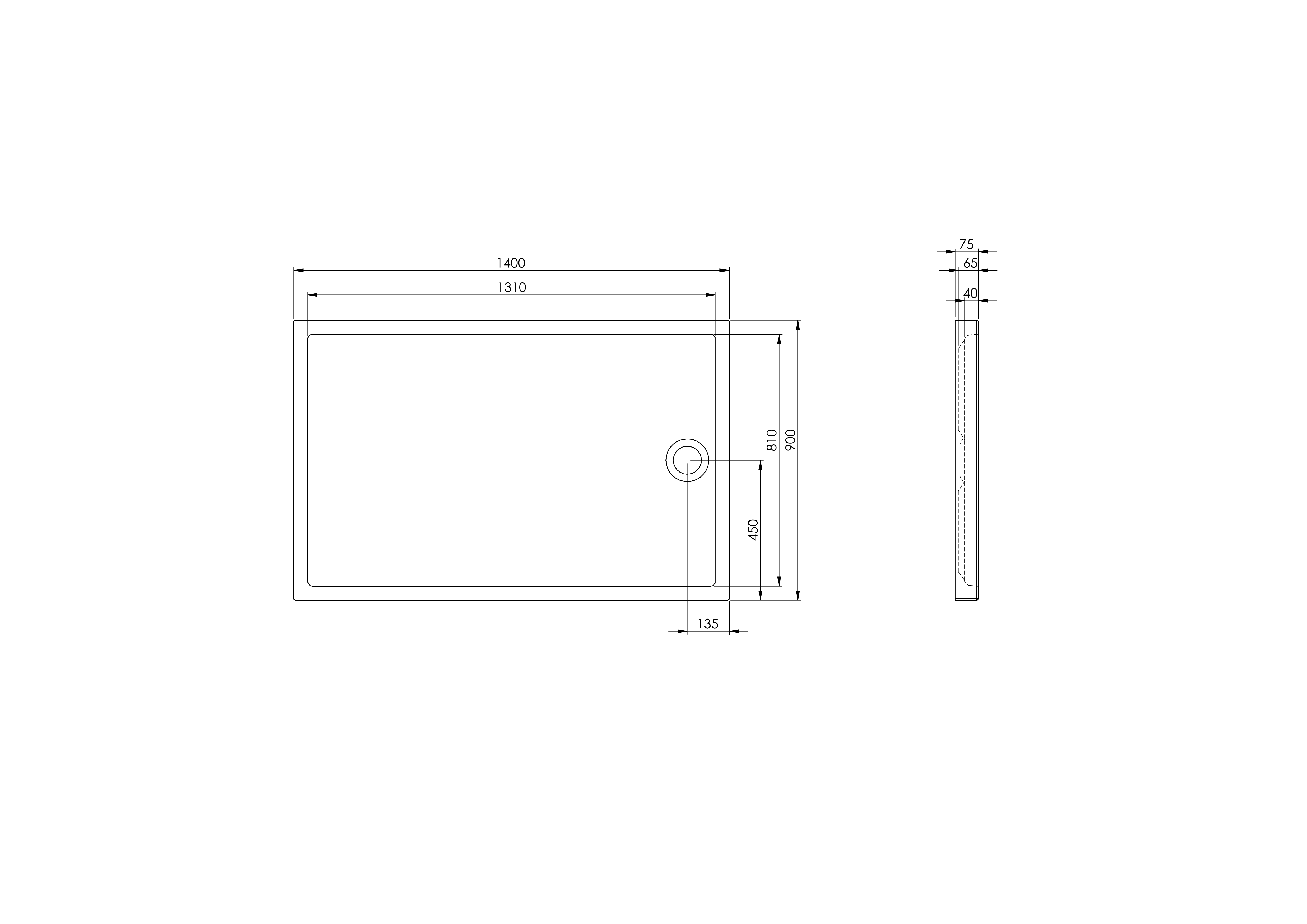 Brodzik wykonany z akrylu o grubości 3,2 mm ze zintegrowaną obudową, wysokość 7,5 cm, bez syfonu i bez nóżek. Do montażu bezpośrednio na posadce bez stosowania nóżek.