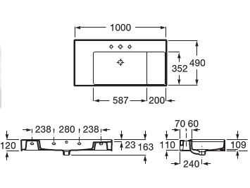 Umywalka z otworem na baterię, z otworem przelewowym, zawiera zestaw mocujący do ściany. Artykuł pakowany w kartonowe pudło. Sposób instalacji: montaż do ściany