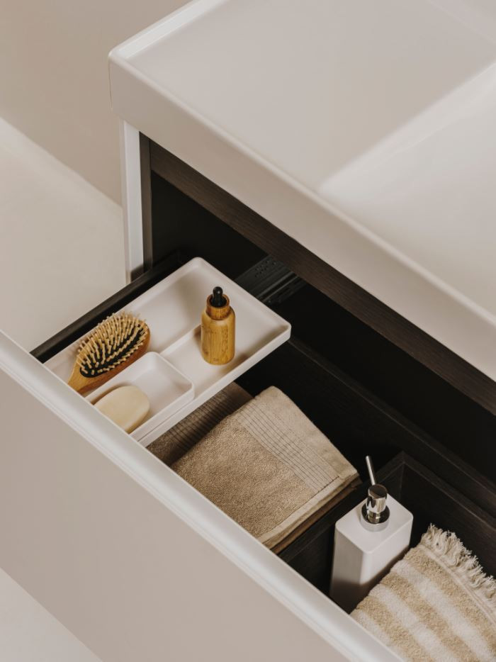 Kolekcja Ona oferuje doskonale zaprojektowane meble łazienkowe, które zapewniają komfort użytkowania, zachowując jednocześnie spójny i naturalny wygląd przestrzeni łazienkowej. Meble Ona posiadają zintegrowane uchwyty, a górna szuflada wyposażona jest w organizer, który zapewnia doskonały porządek. Zestawy szafek z umywalkami dostępne są w wersji Compacto bądź standardowej, a ich szuflady posiadają eleganckie, ciemne wykończenie.
