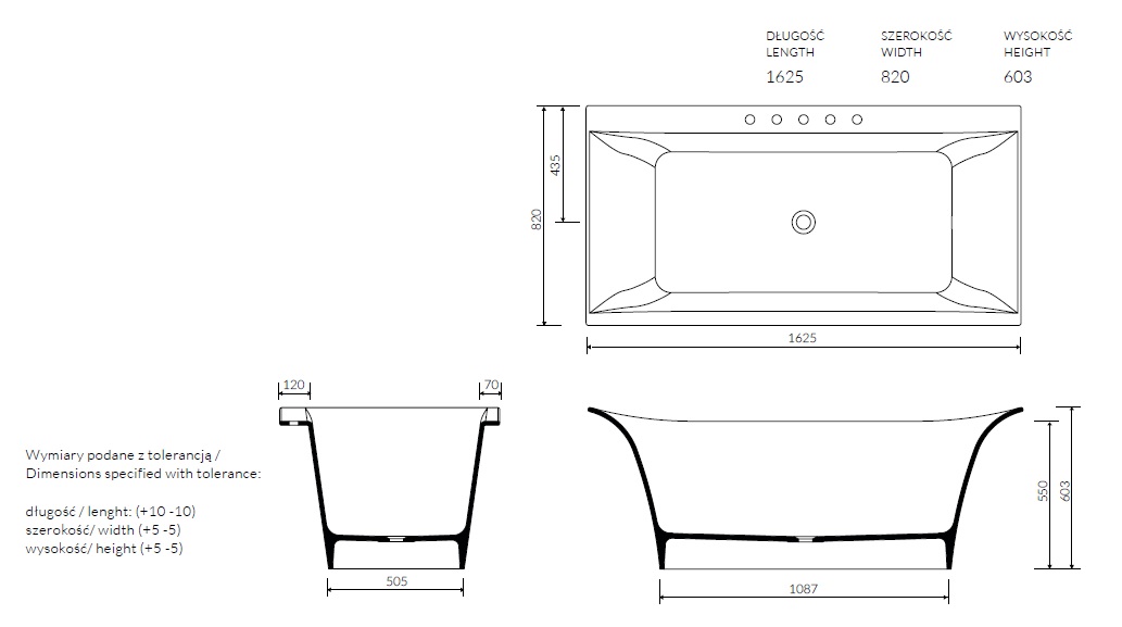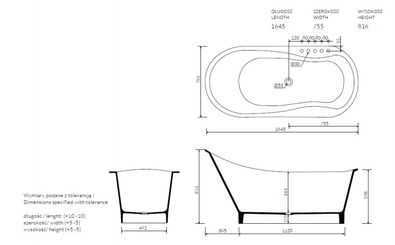 Możliwość zamówienia wanny również w wersji z 3, 4 lub 5 otworami na baterię po prawej lub lewej stronie.