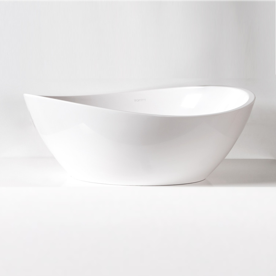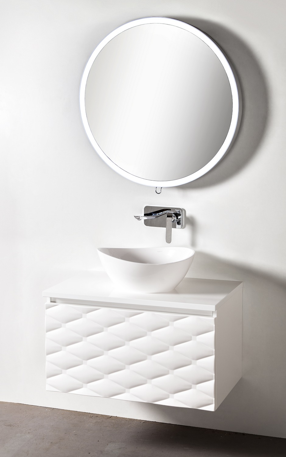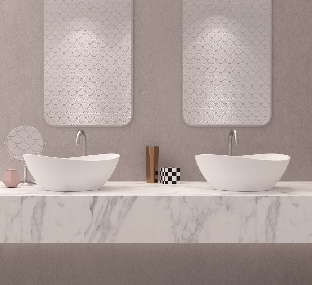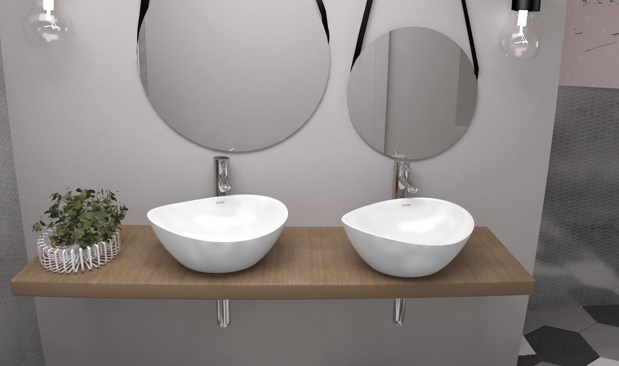 Nowoczesna umywalka nablatowa w kolorze klasycznej bieli. Wykonana z dolomitu, który jest składnikiem materiału kompozytowego MINERALICAST®.