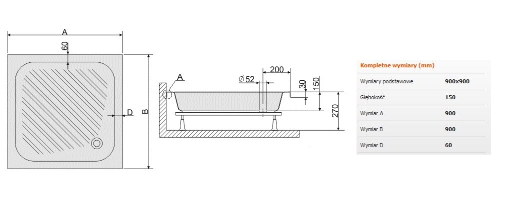 Brodzik kwadratowy B/CL o głębokości 15 cm, wykonany jest z akrylu sanitarnego i kompletowany ze stelażem.