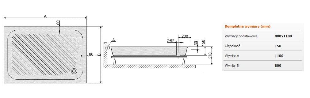 Brodzik prostokątny B/CL o głębokości 15 cm, wykonany jest z akrylu sanitarnego i kompletowany ze stelażem.