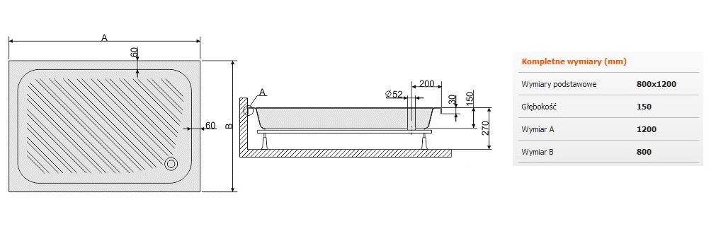 Brodzik prostokątny B/CL o głębokości 15 cm, wykonany jest z akrylu sanitarnego i kompletowany ze stelażem.