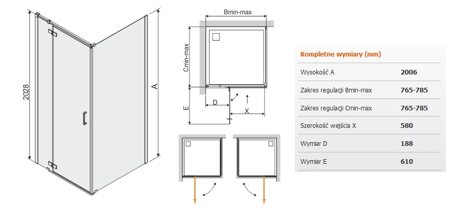 Drzwi skrzydłowe połączone ze ścianką stałą i boczną to doskonała konstrukcja do montażu w narożniku.