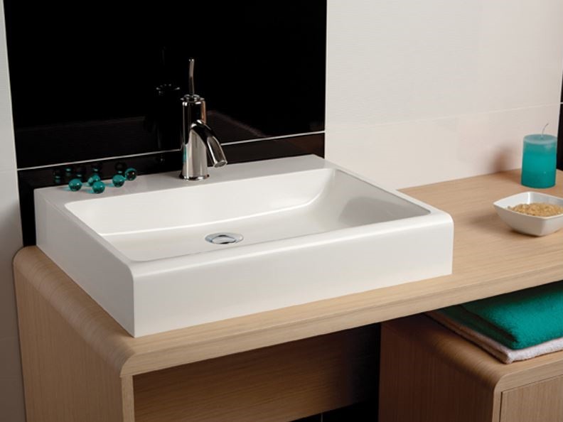 Prostokątna umywalka nablatowa Free Mineral jest wykonana z odlewu mineralnego.