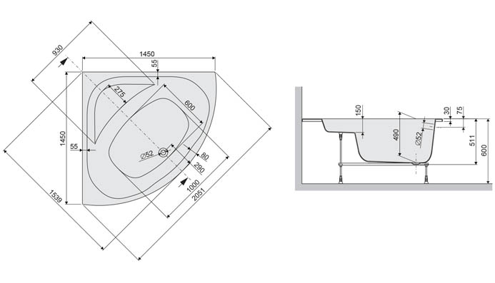 Głębokość 49 cm zapewnia optymalne warunki kąpieli, a duża niecka niczym nie skrępuje kąpieli nawet dwóm osobom.
