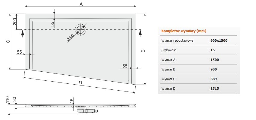 Brodzik BTP-M/SPACE 90x150x1,5 biew