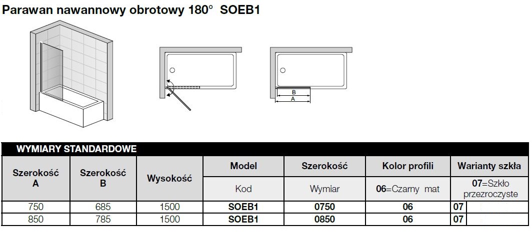 Sanswiss Solino Parawan wannowy 1-częściowy, obrotowy 180stopni.
