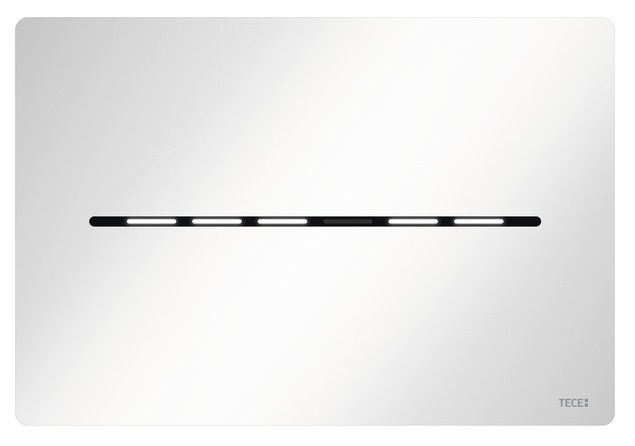 Czujnik wykrywa, gdy ktoś zbliża się do toalety i tylko wtedy podświetla przyciski spłukujące. uruchamianie spłukiwania za pomocą lekkiego dotyku lub bezdotykowo. Elektronikę WC TECEsolid można dopasować do indywidualnych wymagań za pomocą aplikacji programującej.