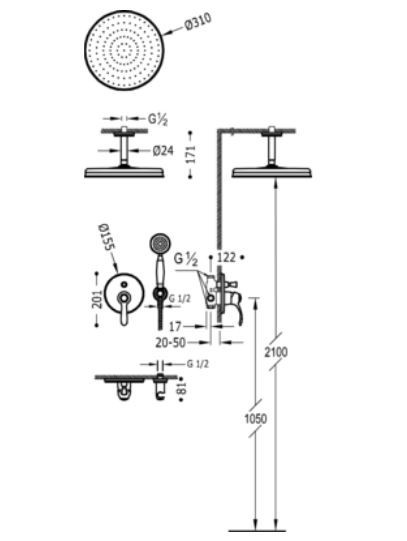 • deszczownica okrągła Ø 310 mm z ramieniem sufitowym