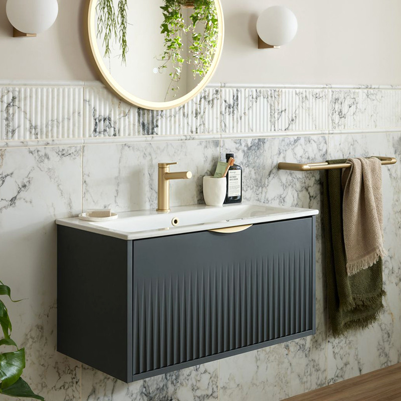 Safari prezentuje dwa różne, ale wzajemnie uzupełniające się style. Pierwszy to eleganckie baterie z dźwignią połączone z minimalistycznymi szafkami o fazowanych krawędziach, które tworzą ponadczasowy design oparty na prostych liniach i gładkich powierzchniach. Drugi styl charakteryzują baterie z ryflowanymi uchwytami, wprowadzające odważny, organiczny akcent do przestrzeni łazienkowej.