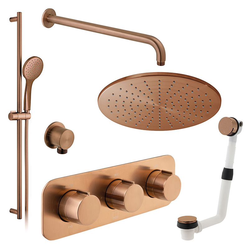 Zestaw prysznicowy termostatyczny 3-drożny z deszczownicą, zestawem z drążkiem i syfonem z funkcją napełniania wanny.