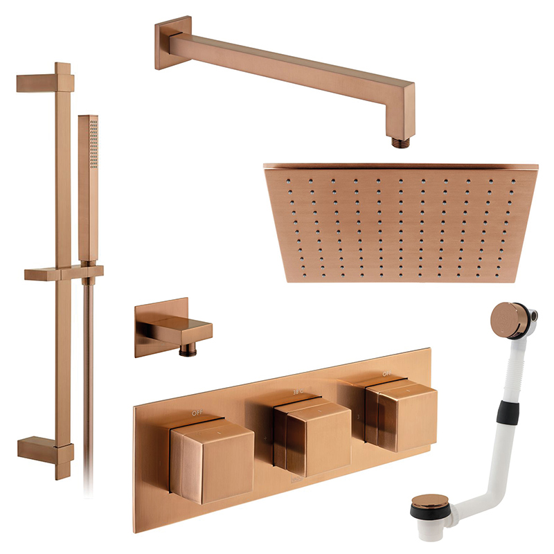 Zestaw prysznicowy termostatyczny 3-drożny z deszczownicą, zestawem z drążkiem i syfonem z funkcją napełniania wanny.