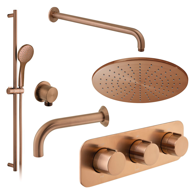 Zestaw prysznicowy termostatyczny 3-drożny z deszczownicą, zestawem z drążkiem i wylewką wannową.