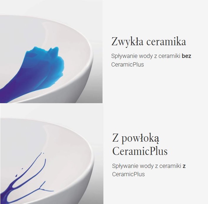 CeramicPlus – odporna na zabrudzenia powierzchnia ceramiki sanitarnej – ułatwia czyszczenie łazienki. Innowacyjna technologia uszlachetniania ceramiki sprawia, że kropelki wody na jej powierzchni natychmiast łączą się w większe krople i spływając, zabierają rozpuszczony brud i osady z kamienia.