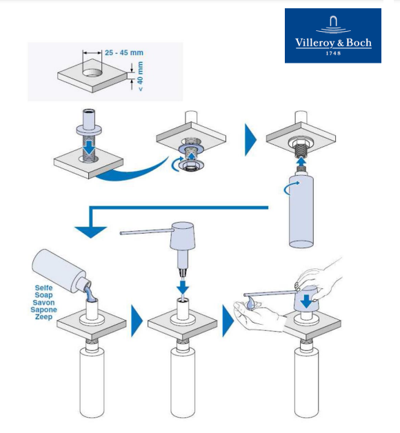 Wszechstronność jest atutem firmy Villeroy&Boch. Dotyczy to również najmniejszych akcesorii kuchennych. Dozownik mydła można z łatwością napełnić mydłem lub płynem i używać bezpośrednio na zlewie. Dzięki temu można uniknąć bałaganu z pojemnikami z detergentami oraz nieestetycznych plam na powierzchni roboczej. Nowoczesne wzornictwo w wyrazistej formie symbolizuje higienę i porządek w kuchni