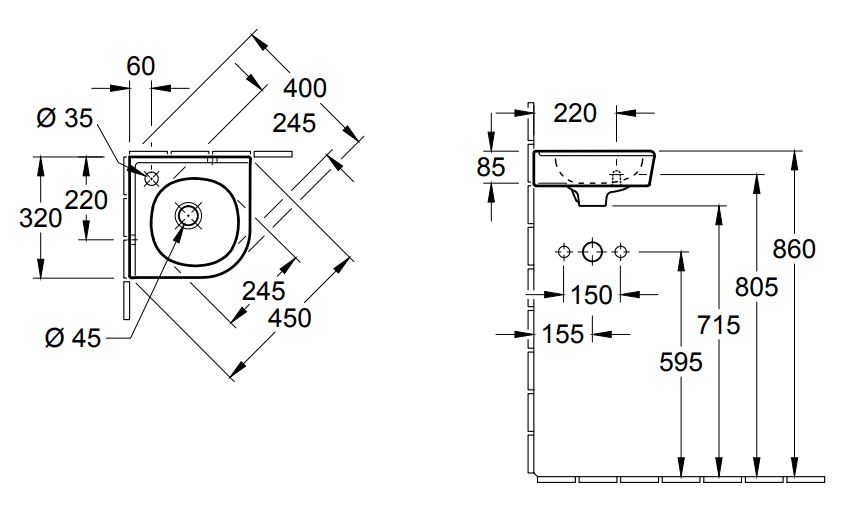 Umywalka narożna O.Novo, z otworem na baterię, z otworem przelewowym.